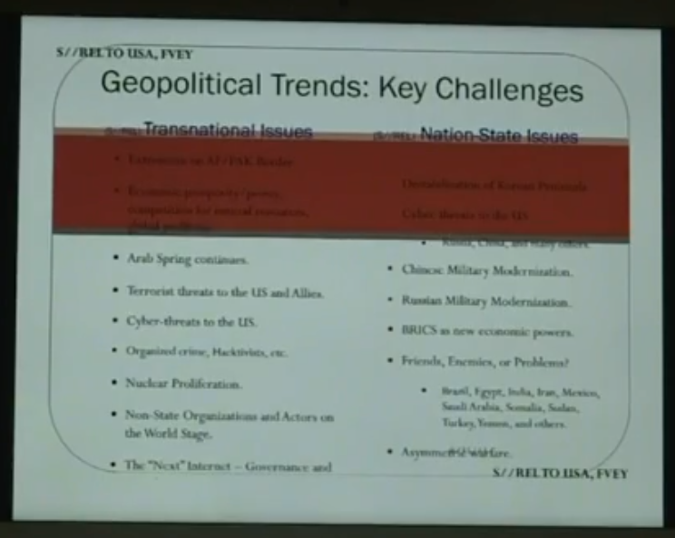 The decision to redact this slide is questionable and reflects a common pattern in the published Snowden documents: redacting information that does not meet a high threshold for secrecy. The bar for redacting information in public interest disclosures should be exceptionally high, not applied to general (geo)political observations like these.