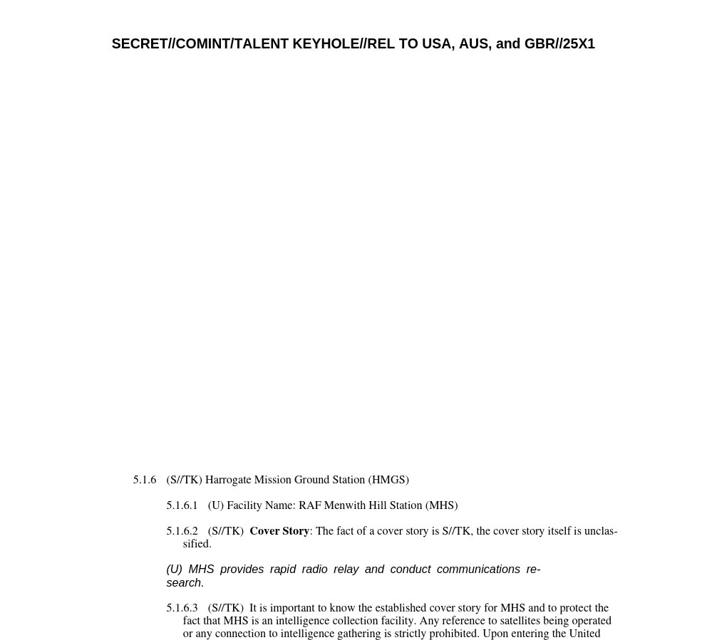 There is a deliberate pattern in these two classification guides: detailed sections describing specific U.S. facilities were removed, while equivalent foreign facility sections were published intact. The 2016 Menwith Hill guide had its PMGS section (5.1.5) completely removed. The 2017 Pine Gap guide had its CDMGS section (5.1.2) completely removed. Both guides retained their detailed descriptions of foreign facilities, including operational designations, cover stories, and visitor protocols.